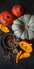 Rustikální podzimní zátiší s dýní, skořicí, muškátovým oříškem, kardamomem a badyánem. Tato hřejivá a útulná kompozice zachycuje esenci podzimní sklizně a chutě sezóny, ideální pro kuchyně a slavnostní vánoční výzdobu.