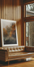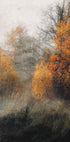 Malebný podzimní les mizející v měkké mlze se zářícími oranžovými a jantarovými listy navrstvenými proti tlumeným šedozeleným pruhům. Texturovaný styl dodává zasněný a atmosférický výraz, který zachycuje tichý přechod podzimu. Plakát klidné přírody pro teplou stěnu galerie.