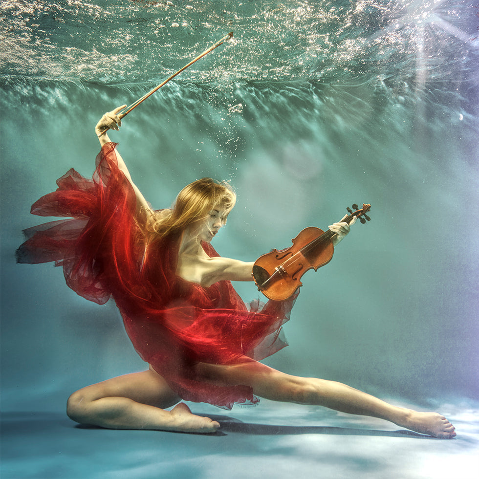 Snový podvodní portrét, kde pár plave v bazénu a hraje na housle mezi svítícími bublinami a kymácejícími se květinami. Romantika a hudba se snoubí v tiché předehře, která vyzařuje poezii, vášeň a beztížnou eleganci. Fotografie od Uniquecapture, vytvořená k vyvolání emocí. Perfektní jako centrální poutač v domácnosti.