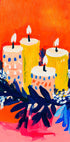 Treechild's Radiant Candle Glow zachycuje ticho zimních nocí: shluk mihotavých svíček namalovaných odvážnými, dětskými tahy štětcem, které vrhají teplé oranžové, růžové a modré na zasněné pozadí. Útulný a slavnostní přináší adventní kouzlo a sváteční světlo do moderních interiérů po celou sezónu. Ideální pro vánoční osvětlení.