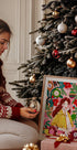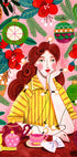 Teplá retro vánoční scéna: Usměvavá rusovlasá žena v pruhované halence si užívá kouřící čaj vedle třpytivého vánočního stromku plného cetek a girland. V okně se třpytí sníh, barvy v růžové a borovicově zelené vytvářejí nostalgii. Útulná ilustrace inspirovaná polovinou století od Caroline Bonne Müller. Ideální pro zimní radovánky.