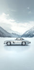En retro sølvbil parkeret ved en frossen sø, omgivet af sneklædte bjerge og en høj, klar vinterhimmel. En elegant model tilfører et strejf af ski-lodge glamour og luksuriøs nostalgi. Kontrasten mellem isens ro og bilens klassiske linjer skaber en stemningsfuld, tidløs scene. Perfekt til elskere af retro og vinterlige landskaber.
