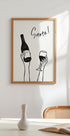 Ruce držící láhev vína a sklenici vína s textem "Na zdraví!" ve francouzském plakátu