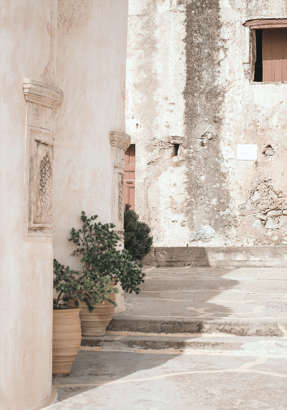 Klidný motiv rustikálního koutu ve středomořské ulici se starými zdmi, rostlinami v květináčích a měkkým slunečním světlem. Toto umělecké dílo zachycuje nadčasové kouzlo středomořské architektury a krásu jednoduchosti, ideální pro vytvoření relaxační atmosféry.