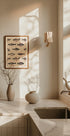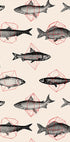 Plakát moderního umění s detailními ilustracemi ryb v kombinaci s geometrickými červenými tvary. Opakování a symetrie vytvářejí jedinečný vzor, který spojuje přírodu s abstraktní geometrií, což z něj dělá pozoruhodný kus moderního nástěnného umění.