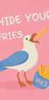 Nezvyklá a vtipná ilustrace racka, který krade hranolky, s hravým textem „Hide Your Fries“. Tento barevný plakát vnáší do domova plážovou atmosféru a drzé kouzlo a je ideální do kuchyně, dětského pokoje nebo interiérů, které zahrnují humor a lehký design.