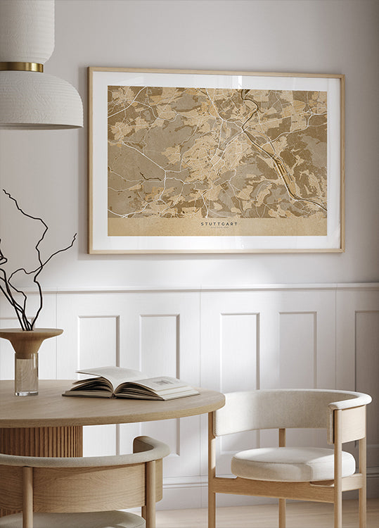 Sépiová retro mapa centra Stuttgartu v Německu od Rosany Laiz Blursbyai - Papír prémiové kvality s hladkým matným povrchem a elegantním dojmem. Matný povrch snižuje odlesky a dodává rafinovaný, nadčasový vzhled. Pevný a odolný pro dlouhodobé používání, ideální pro profesionální prostředí i dekorativní displeje.