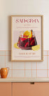 Živý plakát Sangria inspirovaný vintage stylem, klasický španělský punč vyrobený z červeného vína a čerstvého ovoce. S odvážnou typografií, citrusovými detaily a sklenicí plnou barev evokuje umělecké dílo iberské kouzlo a nadčasovou barovou kulturu – ideální pro kuchyně, jídelny nebo koktejlové nadšence.