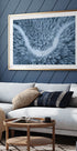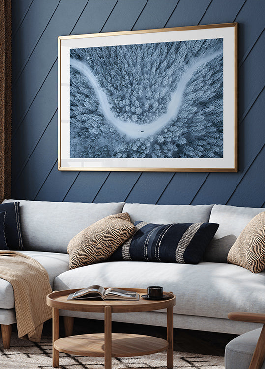Et betagende luftfoto af en sneklædt landevej, der snor sig gennem tætte, mørke fyrreskove. Små biler prikker ruten og giver målestok, mens vinterens stille ro sænker sig over landskabet. De skarpe kontraster mellem hvid sne og dybe grønne nuancer skaber et grafisk, minimalistisk udtryk af Gerald Macua.