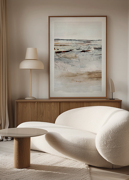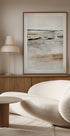 Klidný abstraktní pobřežní obraz od Dana Hobdaye s vrstvenými texturami a jemnými tahy štětcem v zemitých tónech béžové, bílé a nádechem rzi. Minimalistická, malířská kompozice navozuje pocit pobřežních horizontů a kombinuje moderní abstrakci s přírodním klidem. Perfektní kousek do moderních interiérů s přímořskou nebo minimalistickou estetikou.