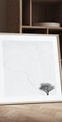 Footprint od MOSTAFA NODEH je evokující, monochromatický plakát: stopy v čerstvě napadlém sněhu vedou k osamělému stromu na otevřené zamrzlé pláni. Jemné kontrasty a široká rozloha oblohy vytváří klid, melancholii a hloubku – minimalistický zimní motiv, který vybízí k zamyšlení a tichému dramatu. Horizont mizí v bělosti a čas jako by se zastavil.