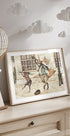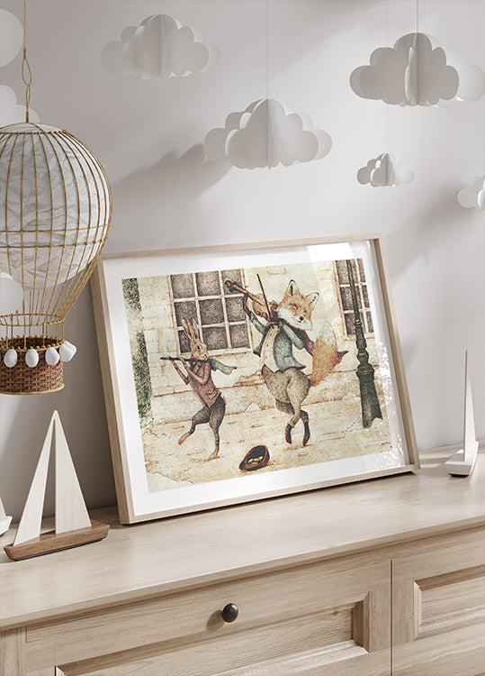 Street Musicians af Mike Koubou skildrer en vinterlig byscene, hvor en elegant ræv og en livlig kanin spiller musik på gaden som små gøglere. Varme toner og retro detaljer giver en eventyrlig, nostalgisk stemning – som en side fra en gammeldags billedbog – perfekt til børneværelse, stue eller entré.
