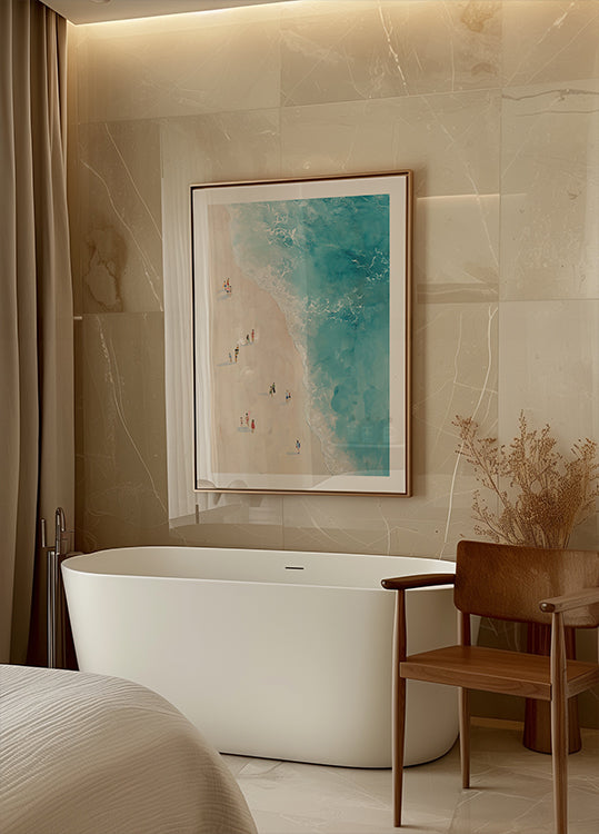 Klidný a stylový záběr lidí procházejících se podél pobřeží, kde se tyrkysové moře setkává se světlým pískem. Ideální pro letní domy, prostory inspirované pobřežím a moderní nástěnné umění.