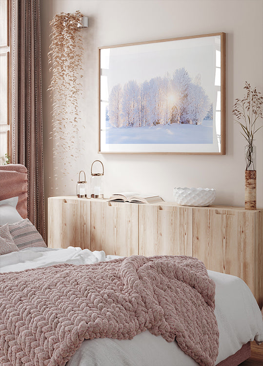 Zimní světlo se vrací do tichého lesního prostoru: štíhlé stromy stojí v mrazu a sněhu, zatímco měkké, zlaté slunce proráží chladné modré tóny a vrhá dlouhé stíny mezi kmeny. "Světlo se vrací" od EMELIEMaria zachycuje klid jasného, svěžího rána, kde příroda tiše dýchá a klíčí naděje.