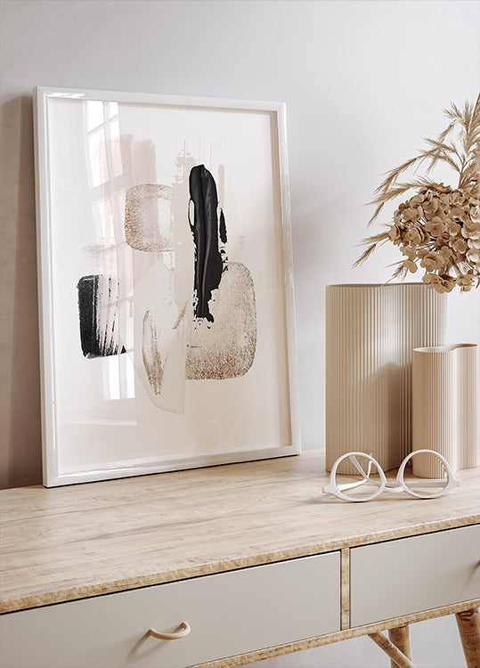 Stylový abstraktní plakát s texturovanými tahy štětcem v černé, béžové a zlaté barvě. Moderní kompozice kombinuje malířské textury s minimalistickou elegancí, ideální pro moderní interiéry a milovníky umění.