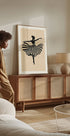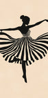 Půvabná černá silueta baleríny uprostřed piruety s pruhovanými šaty splývajícími v elegantním pohybu. Jemné béžové pozadí a silný kontrast dodávají tomuto kousku nadčasový stylový dojem – ideální pro přidání uměleckého pohybu na stěnu obývacího pokoje, studia nebo galerie.