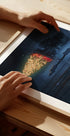 Tichá zimní noc v hlubokých modrých tónech: zasněžený les, zrcadlové lesní jezero a zářivý vánoční stromeček, jehož světlo se odráží ve vodě. U břehu stojí dívka v zádumčivém klidu. The Hope of Christmas od Terryho F. zachycuje kouzlo, naději a útulný klid, který doprovází hvězdnou záři Vánoc. Ideální pro vnesení tepla a zasnění do zimní tmy.