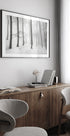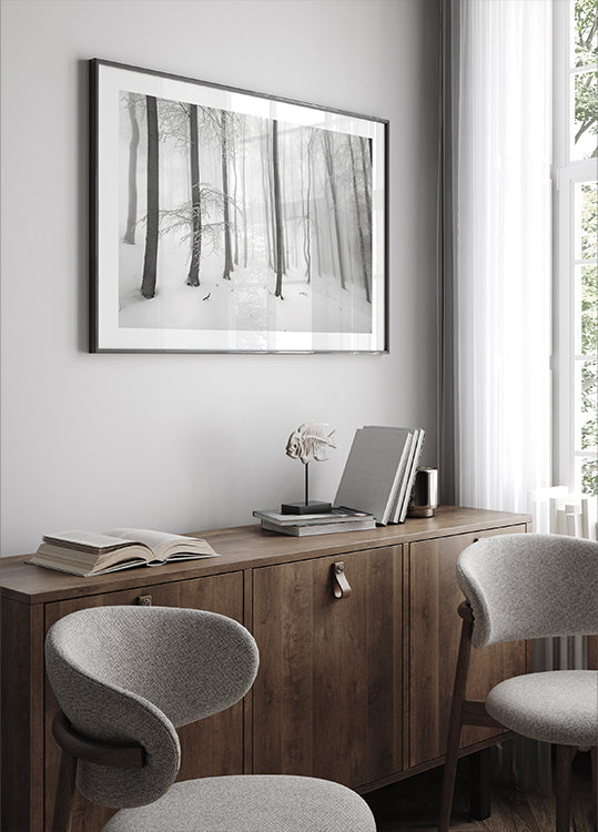 Tichá zimní krajina se rozvíjí v mlze a mrazu, kde štíhlé kmeny buků stojí jako grafické linie v tlumeném zasněženém lesním prostoru. Světlo je jemně filtrováno mlžným oparem a vytváří meditativní poutač, který zachycuje klid mezi stromy. A poetic nature photograph by Tom Pavlasek. Perfect for a winter atmosphere in the home.