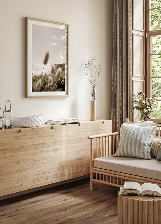 Plakát s zobrazením měkké trávy v horské krajině, ideální pro dodání klidné a přirozené krásy do každé místnosti.