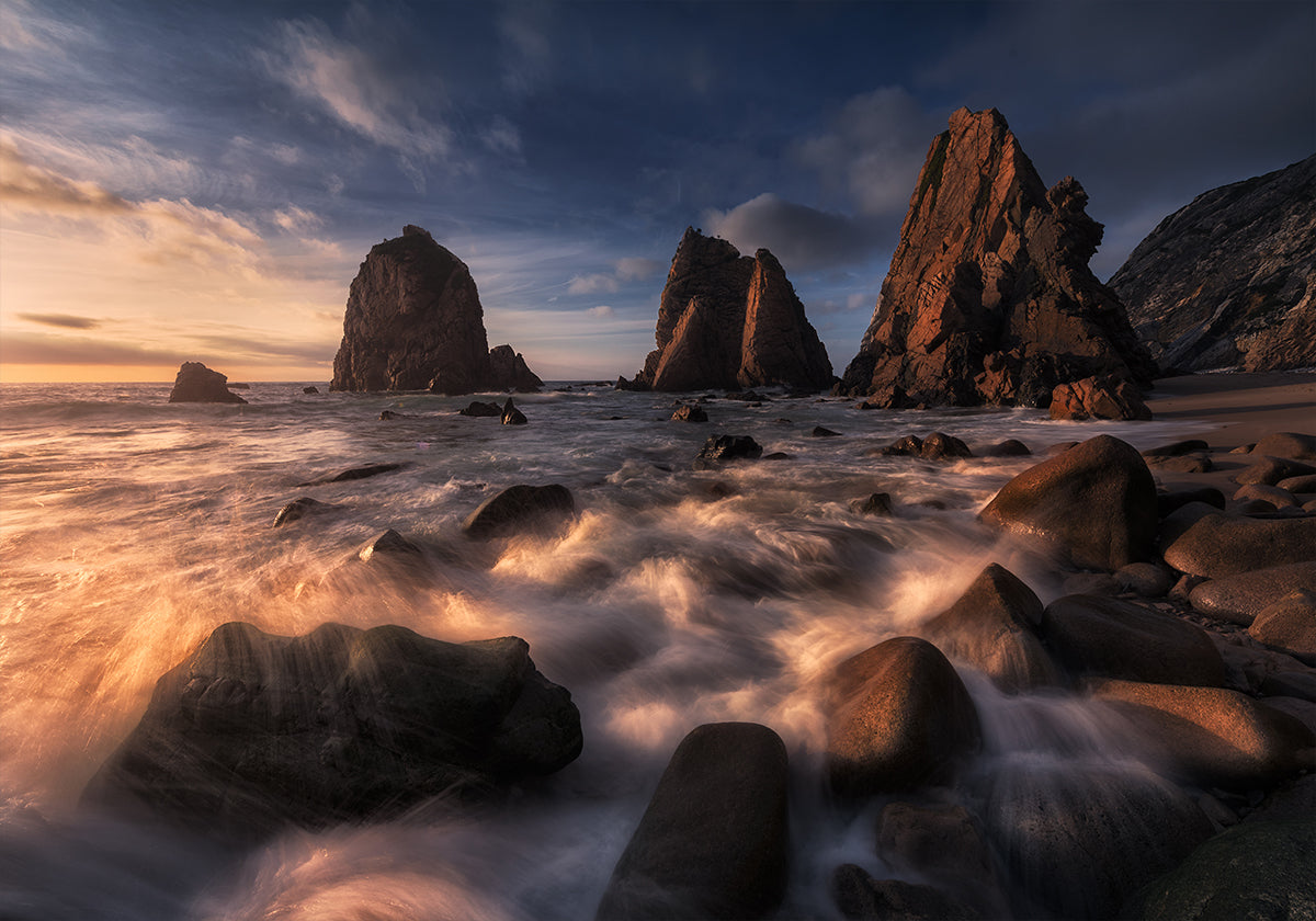 Ursa Beach af Carlos F. Turienzo indfanger Atlanterhavets rå poesi ved Sintra: dramatiske klippetinder rejser sig af havet, mens gyldent tusmørke kærtegner skumhvide bølger. En stemningsfuld seascape, hvor bruset, lyset og tidevandet mødes i et tidløst øjeblik ved Portugals vildeste kyst. Perfekt til at drømme sig væk mod horisonten.