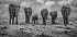 Ostrá černobílá fotografie divoké zvěře zachycující stádo slonů potulujících se africkou savanou. Obraz zachycuje sílu i něhu a symbolizuje rodinu, ochranu a jednotu v přírodě.