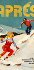 Nostalgická après-ski plakátová scéna: usměvavý pár ve vintage stylu opékající whisky, obklopený zasněženými horami a atmosférou retro chaty. Teplé jantarové barvy se setkávají s křišťálově čistým zimním vzduchem a detaily jako lyžařské hůlky, rukavice a úplety udávají tón. Ideální pro barovou stěnu, chatu nebo zimní sny po celý rok.