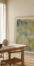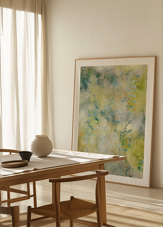 Jemné impresionistické umělecké dílo, které mísí botanické formy s měkkými malířskými texturami. Jemné odstíny zelené, modré a zlatožluté vytvářejí snovou a poklidnou atmosféru, která zachycuje prchavou krásu přírody. Ideální pro přidání uklidňující a umělecké atmosféry do každé místnosti