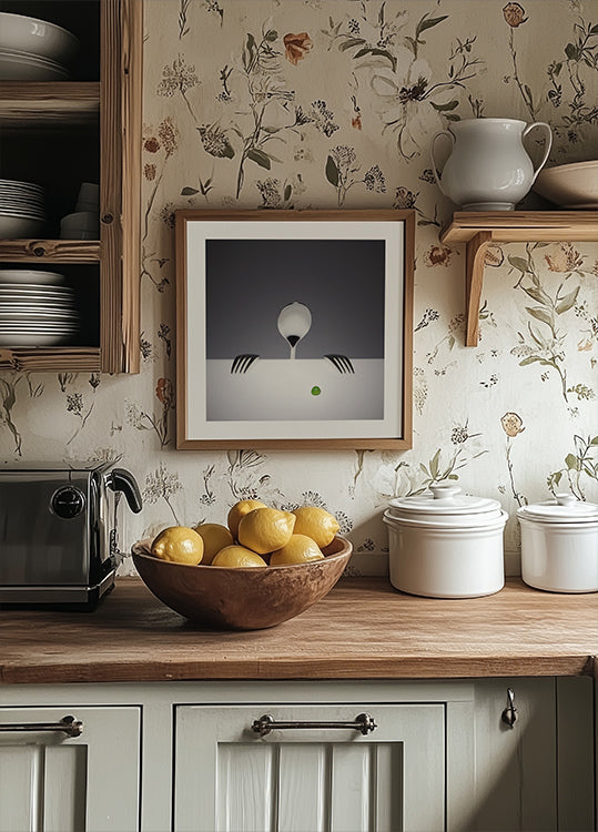 Hravý a lehce koketní plakát od Wieteke de Kogel: jediný zelený hrášek se dvoří lžičkou a vidličkou, která téměř získává osobitost. Čisté linie, svěží zelený akcent a grafický klid dělají z motivu moderní konverzační startér v kuchyni, jídelně nebo kavárně – s okouzlujícím jiskřením v očích.