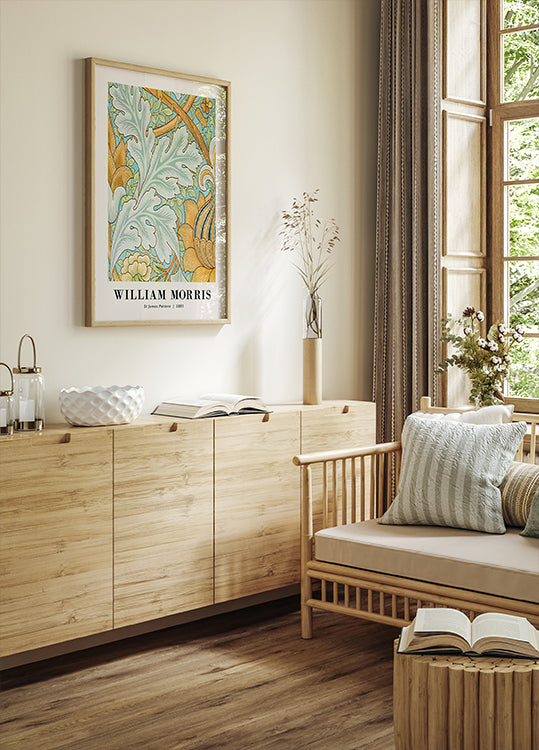 Jasný a zdobený vzor od Williama Morrise. Vzor svatého Jakuba (1881) se vyznačuje elegantními akantovými listy, stylizovanými květy a jemnými liniemi v mátově zelené, okrové a světle modré barvě. Vynikající příklad Morrisovy schopnosti převést krásu přírody do harmonického designu.