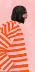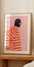 Toto umělecké dílo má minimalistický design, který zdůrazňuje ženu v červenobílém pruhovaném oblečení na jemném růžovém pozadí. Moderní estetika a odvážné použití barev vytvářejí osobitý vizuální výraz, ideální pro milovníky moderního umění.